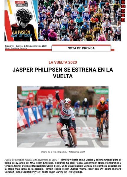 Creation and sending of 108 press releases in three languages (ES -EN – FR) on behalf of the organization of the Tour of Spain 2020.