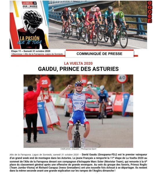 Création et envoie de 108 communiqués de presse en trois langues (ES -EN – FR) pour le compte de l’organisation du Tour d’Espagne 2020.